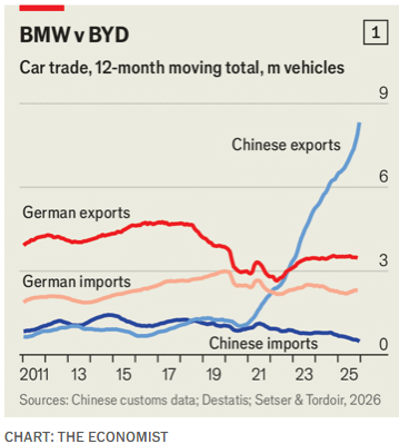德国汽车等商品对华出口大幅下滑,而面对内卷的中国企业出口激增,使德国对华贸易逆差达到900亿欧元(1050亿美元),相当于德国国内生产总值的2%。在国内需求疲软的背景下,中国汽车等产品出口商还正在第三国市场抢占德国竞争对手的份额。
