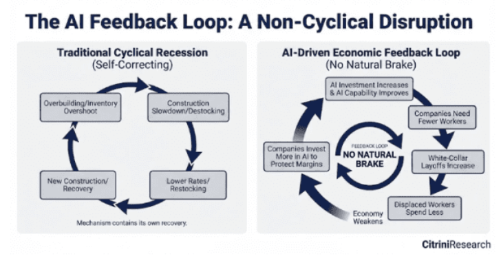 在正常衰退中,原因最终会自我修复。但这次衰退的原因并非周期性。企业裁员后,会用节省的资金购买更多人工智能,从而进一步裁员。员工减少,消费随之下降。这是一个没有自然制动机制的反馈循环。