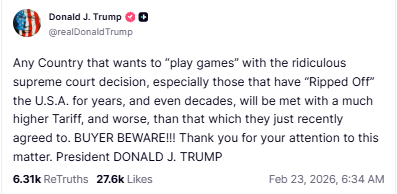 “任何国家如果想借着这个荒谬的最高法院裁决‘耍花招’,尤其是那些多年来、甚至几十年来‘占美国便宜’的国家,都将面临比刚刚达成协议时更高、甚至更糟糕的关税。买家自负!!!”特朗普在Truth Social上写道。