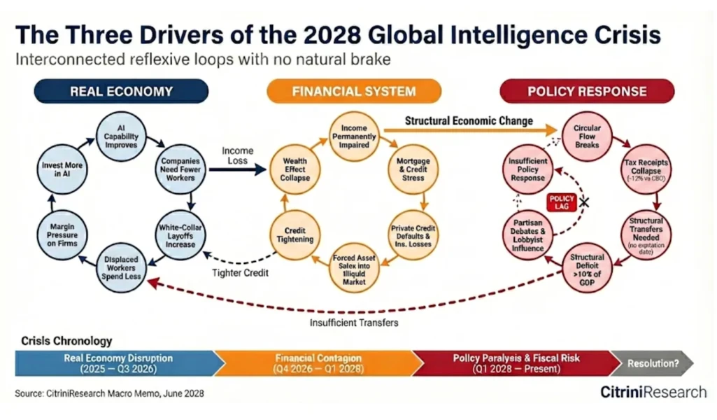 FX168财经报社(北美)讯 Citrini Research在一份题为《2028全球智能危机》(The 2028 Global Intelligence Crisis)的宏观情景研究中,给出了一个极具挑衅性的“反直觉”推演:如果人工智能(AI)革命推进得太快、太彻底,AI的成功本身反而可能成为经济与金融不稳定的主要引擎。该报告由Alap Shah等共同撰写,核心假设是到2028年全球经济可能陷入“智能替代螺旋”(intelligence displacement spiral)——机器智能极度充裕,迅速替代复杂白领劳动,引发需求坍塌、结构性通缩与资产价格重估。