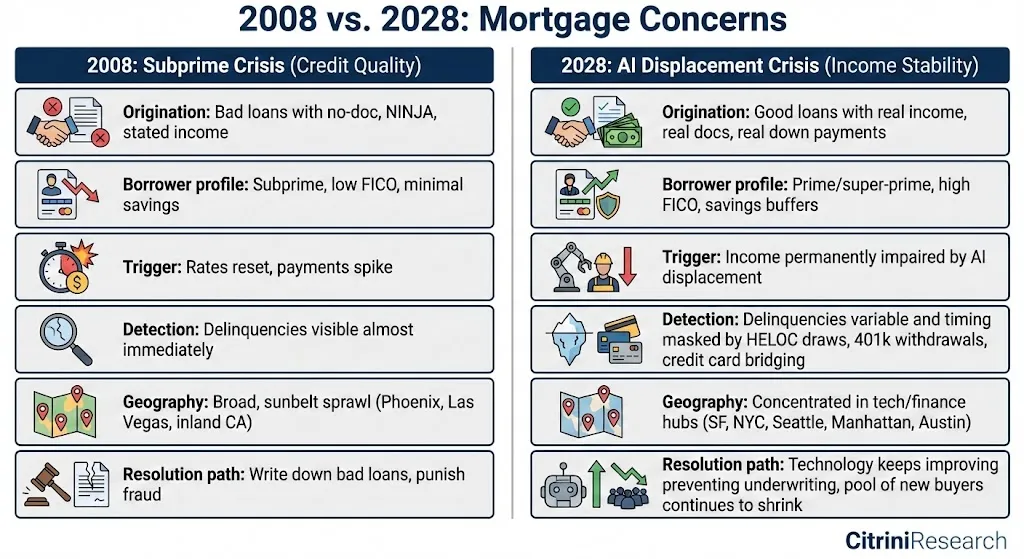 房地产危机、财政困局与社会撕裂报告最“刺耳”的部分在于对美国住宅按揭市场(约13万亿美元)的担忧。它认为,与2008年“坏在起点”的次贷不同,2028情景的风险是“起点很好,但世界变了”。传统按揭承销隐含假设是:FICO 780的借款人能在30年里维持收入水平。