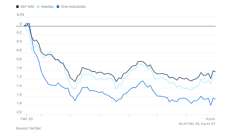 周一投资者对人工智能的担忧蔓延至金融和可选消费板块,道琼斯工业平均指数大幅下挫,下跌822点,跌幅1.7%。标普500指数下跌1%。纳斯达克综合指数下跌1.1%。