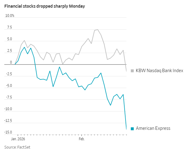 美国运通、维萨、摩根大通、高盛集团、DoorDash以及第一资本金融等股票周一大幅下跌。标普500指数金融板块录得自4月以来最差表现。投资者正在评估人工智能可能对支付处理费用产生的影响。这些费用每年为行业带来数十亿美元收入。