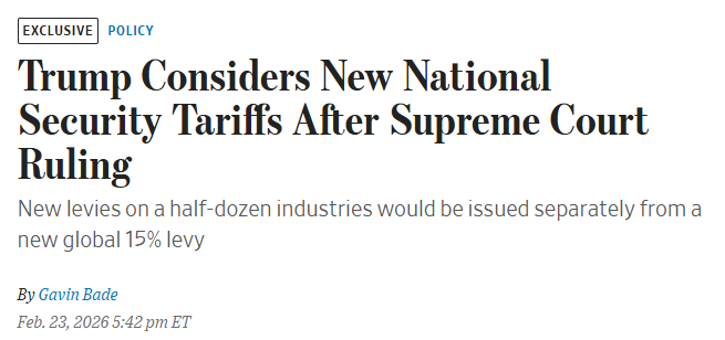 FX168财经报社(北美)讯 在最高法院上周裁定特朗普多项第二任期关税措施无效后,白宫正酝酿以“国家安全”为由开辟新的加税通道。据华尔街日报周一(2月23日)援引知情人士称,特朗普政府考虑依据《1962年贸易扩展法》第232条,对包括大型电池、铸铁及管件、塑料管材、工业化学品、电网与电信设备等在内的多个行业启动或推进关税调查,以维持对外贸易施压并重塑关税收入结构。