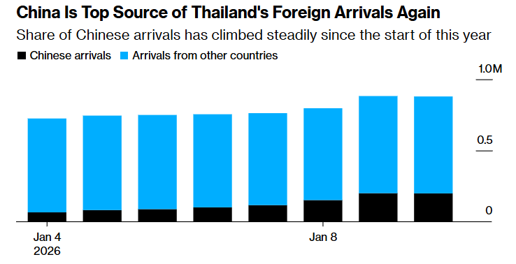尽管当周来自中国的入境人数略有回落,但中国已连续七周保持泰国最大游客来源国地位,且规模仍明显领先马来西亚——后者在去年大部分时间里一直是泰国入境旅游的第一大来源。