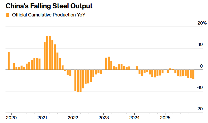 国家统计局上月表示,2025年粗钢产量同比下降4.4%,至9.61亿吨。这是六年来年度产量首次跌破10亿吨,发生在政府承诺整治行业长期产能过剩之后。但摩根大通和咨询机构 AME Group 的分析认为,实际生产活动可能明显强于官方统计。
