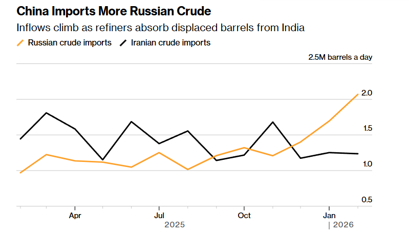 根据Rystad Energy给出的一个情景测算,印度自俄罗斯进口量可能较1月水平下降40%,降至约60万桶/日。大量被“挤出”的俄罗斯货物正转向东方,从而与长期更受中国民营炼厂青睐的伊朗供应商之间引发价格战。