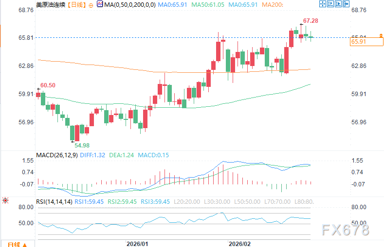 从均线、趋势线与摆动图表看,WTI原油主力趋势仍为上行,但短期面临回调压力。200日均线支撑62.59美元/桶,50日均线支撑61.05美元/桶,后者即将上穿前者形成“金叉”,中长期看涨信号明确。短期来看,油价触及高点后获利盘出逃,5日、10日均线轻微拐头,回调风险上升。