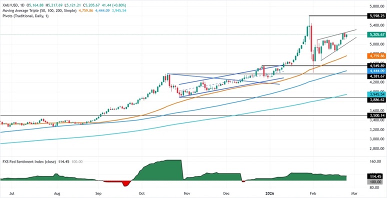 Valencia补充道,另一方面,如果金价未能攻克5249美元/盎司,则可能出现回调,首个支撑位在5150美元/盎司。一旦跌破该支撑位,下一个目标位将是2月24日低点5093美元/盎司,下一个支撑位是20日简单移动平均线(SMA)5033美元/盎司,之后料测试5000美元/盎司。