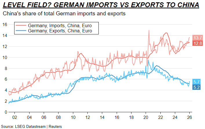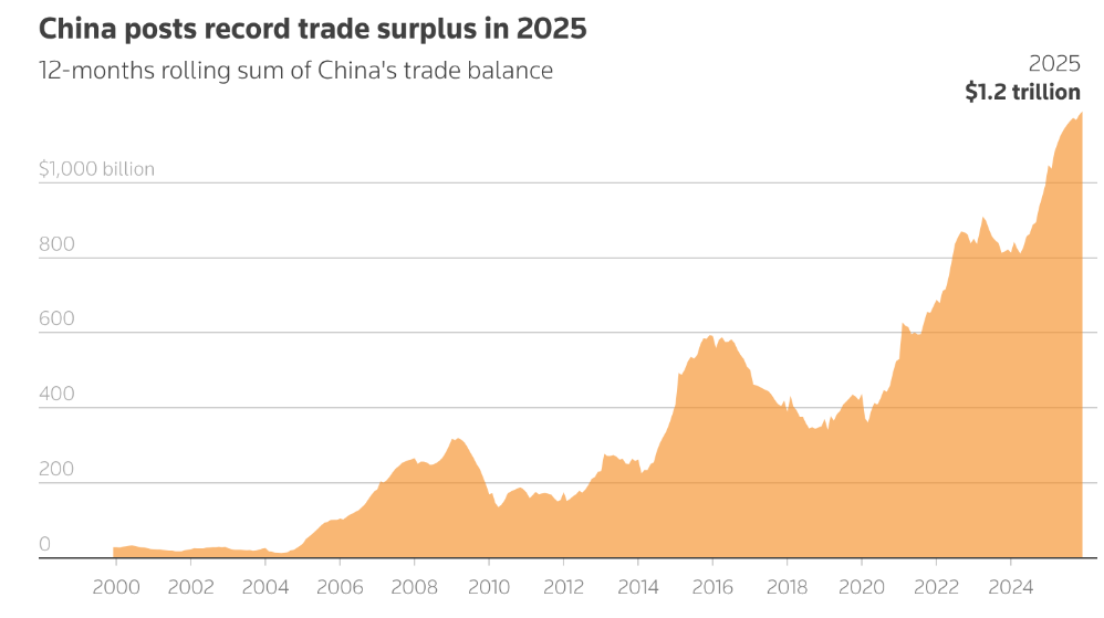 中国是德国最大的单一贸易伙伴。新冠疫情以来,欧中贸易联系进一步加强;与此同时,美中直接贸易则持续大幅下滑。更重要的是,中国整体贸易顺差在2025年膨胀至创纪录的年化1.2万亿美元。