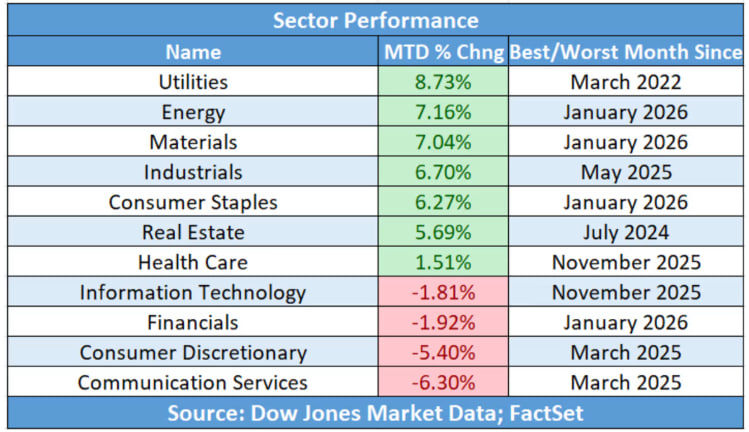分析方面,明天是2月的最后一个交易日,大概已经能看出哪些板块是本月赢家。目前,公用事业板块以8.7%的涨幅领跑,而通信服务板块表现最差,下跌6.3%。今天科技股再度大跌,也将信息技术板块拖入全月亏损区间。如果明天没有出现反弹,这将是板块连续第四个月下跌。
