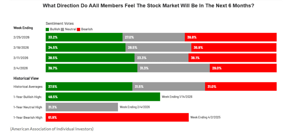 在截至周三晚间的一周调查中,美国个人投资者协会(AAII)发现,仅有33.2%的受访者对未来六个月的股市持看涨态度,低于历史平均的37.5%,也是自11月26日以来的最低水平。
