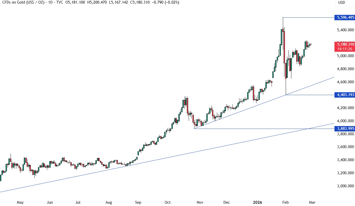 从风险管理角度看:多头在5100支撑位以及一条较小的上升趋势线附近,将拥有更好的“风险回报比”入场机会,以布局冲击新高;空头则希望看到价格跌破该趋势线,从而打开进一步回落至4600附近的空间。