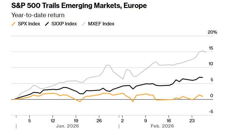 AI的颠覆潜力已连续数周扰动美股,交易员将这一现象称为“AI恐慌交易”。与此同时,AI板块的风向标公司在过去几年持续推动标普500上涨后也开始失去动能,促使投资者转向海外市场与更依赖广义经济增长的公司。