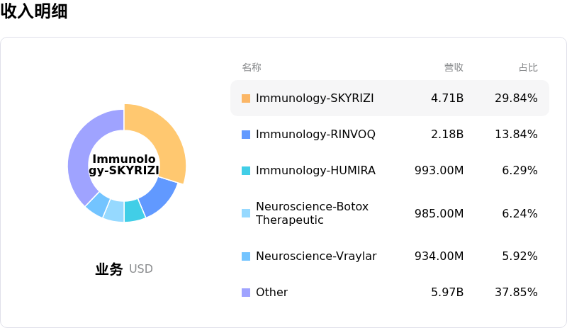 艾伯维 (ABBV) 处于医药与医学研究行业,最新年度营业收入61.16B,处于行业7,净利润4.19B,处于行业14。「公司简介」