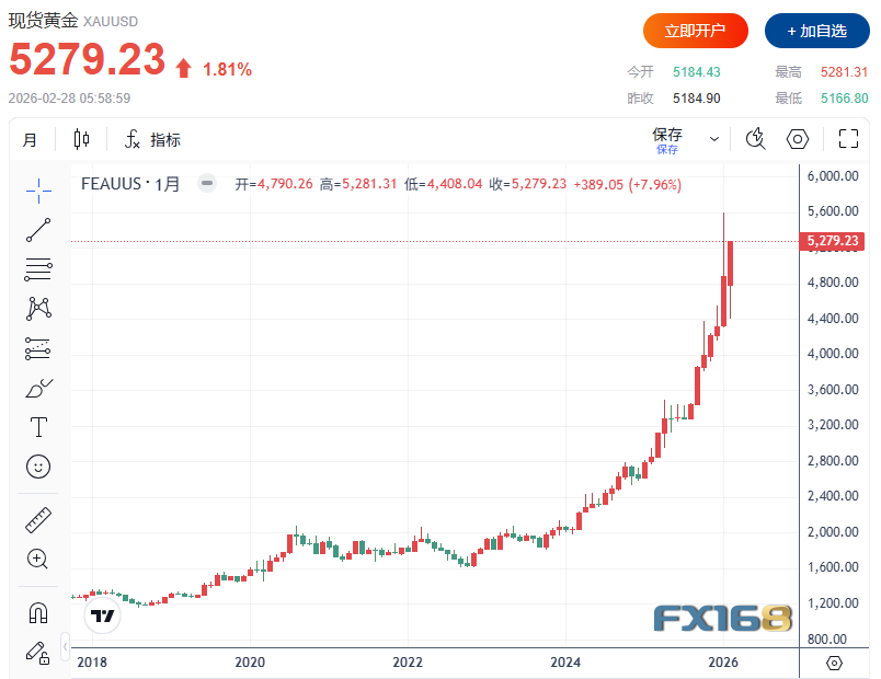 基本面展望:黄金瞄准“连续第七个月上涨”周五(2月27日),现货黄金收报5279.23美元,本月大涨389.05美元,涨幅为7.96%,录得连续第七个月月度上涨。近期的回调曾令市场重新评估,但避险需求的再度升温,推动贵金属快速反弹。