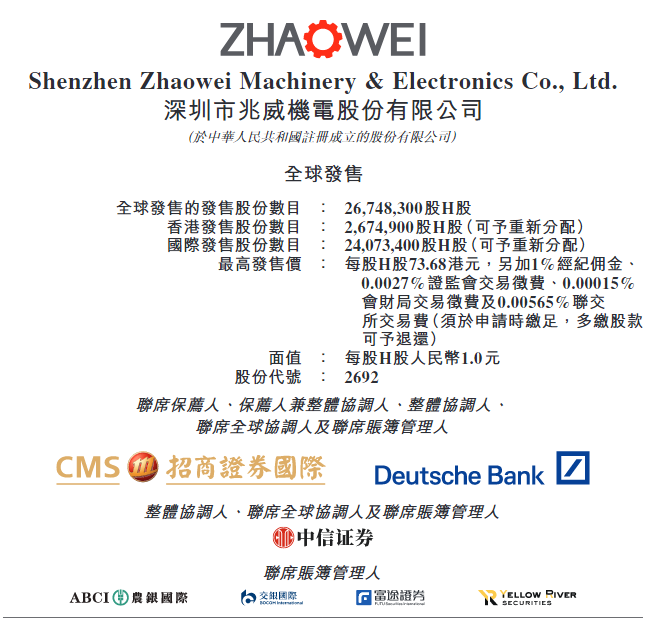 深圳市兆威机电股份有限公司(02692.HK)于2026年2月27日正式启动H股招股,招股价区间为每股不高于73.68港元,每手100股,入场费7,442.31港元,预计于2026年3月9日在港交所主板挂牌上市。