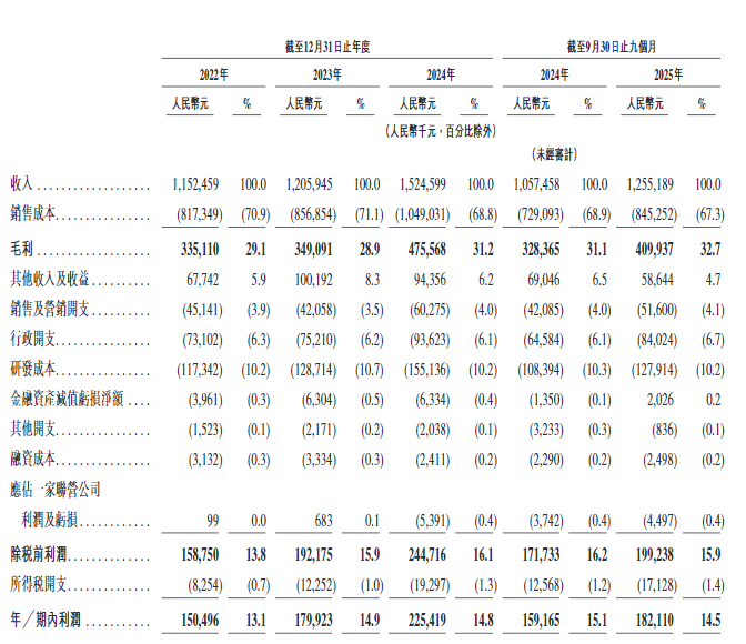 盈利能力稳中有升:公司毛利率从2022年的29.1%提升至2025年前九个月的32.7%,主要得益于产品结构优化及规模效应。净利润从2022年的1.50亿元稳步增长至2024年的2.25亿元,2025年前九个月已达1.82亿元,同比增长14.4%。净利率始终稳定在13%-15%的较高水平,盈利质量优异。