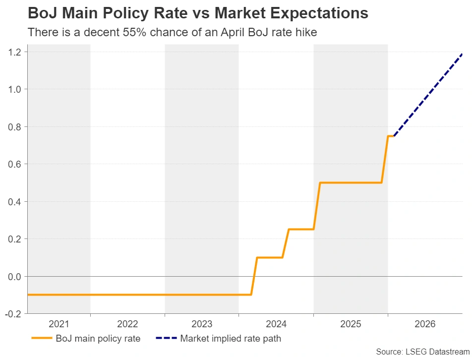不过,日银鹰派成员高田(Takata)强调“通胀过热”需要更多加息,市场对4月加息25个基点的概率升至约55%,对6月加息的定价则接近“充分计入”。整体而言,市场预期日银可能等待春季薪资谈判结果,再决定是否按下下一次加息按钮。