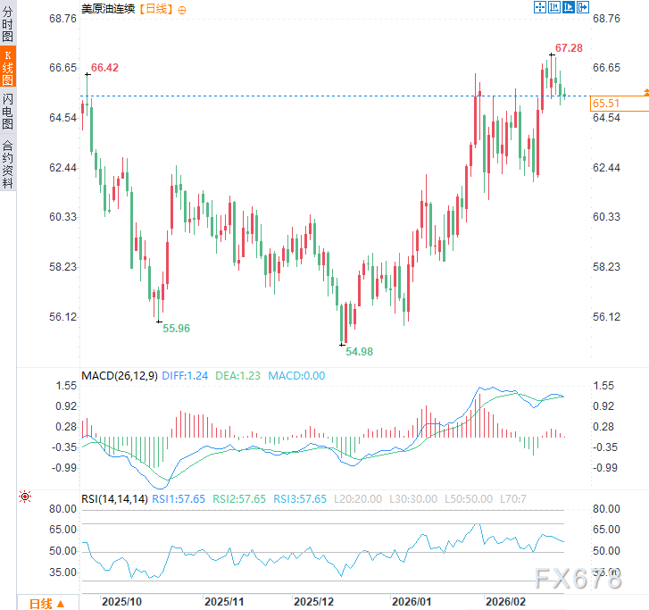 美军大规模部署使霍尔木兹海峡中断预期升温,油价已计入风险溢价。周四(2月26日)欧市时段震荡上涨,现交投于每桶65.60 美元附近,日内涨幅约0.25%。
