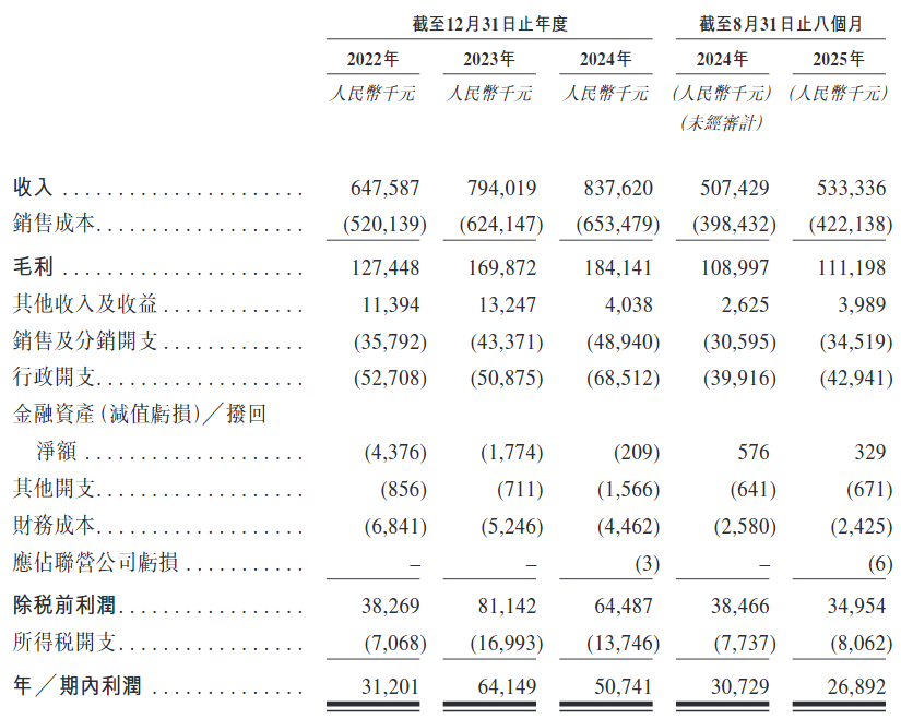 收入稳步增长,核心业务占比提升:公司收入从2022年的6.48亿元增长至2023年的7.94亿元,并在2024年达到8.38亿元,复合年增长率13.7%。2025年前八个月收入已达5.33亿元,同比增长5.1%。从业务结构看,容器服务(共享运营、租赁、增值服务)是收入核心,2024年占比达91.5%,其中共享运营服务占比从2022年的69.1%提升至2024年的80.4%,核心业务地位持续强化。