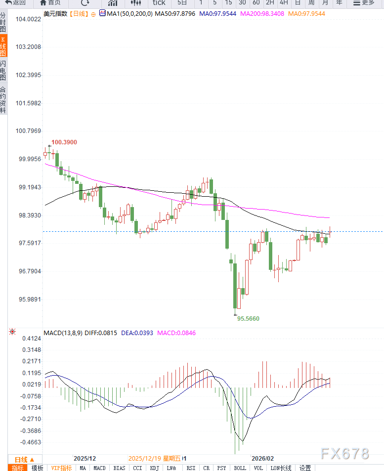 下方支撑方面,97.50为短线关键支撑,一旦跌破可能回踩97甚至96.80区域。从4小时图来看,指数沿短期上升通道运行,但上涨斜率有所收窄。短周期均线维持多头排列,但价格多次上冲未能形成有效突破,显示短线存在技术性修正需求。