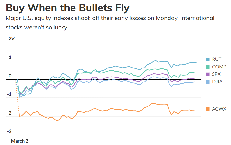 市场或许会倾向于把周一的走势解读为:投资者——至少美股买家——对这场战争可能对全球经济甚至美国本土造成的负面影响显得过于淡定、甚至自满。