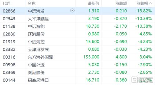 港口航运股集体回调,中远海发跌超13%,太平洋航运、中远海能跌超10%,中远海控、东方海外国际等跟跌。