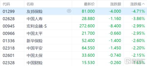 内险股持续跌势,友邦保险跌超4%,中国人寿跌超3%,宏利金融、中国太平、中国平安跌超2%。