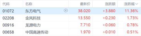电力股走高,东方电气涨超11%,金风科技涨超11%。