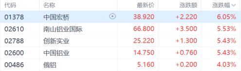 铝业股涨幅居前,中国宏桥涨超6%,南山铝业国际、创新实业、中国铝业涨超5%,俄铝涨超4%。