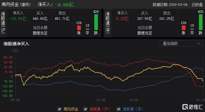 今日,南向资金净卖出4.66亿港元,其中港股通(沪)净卖出10.91亿港元,港股通(深)净买入6.25亿港元。