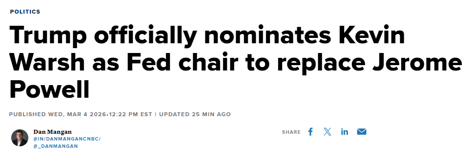 FX168财经报社(北美)讯 美国总统特朗普周三(3月4日)正式提名凯文·沃什(Kevin Warsh)出任下一任美联储主席。白宫表示,提名已提交参议院审议。若获确认,沃什将接替现任主席杰罗姆·鲍威尔(Jerome Powell),并开启为期四年的任期。与此同时,市场普遍认为,特朗普倾向推动更快降息,但在伊朗战争推升能源通胀风险、以及关税政策路径充满不确定性的背景下,未来美联储的政策空间可能反而被进一步压缩。