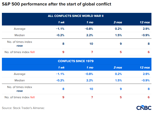 在更近的案例中,2022年2月24日俄罗斯入侵乌克兰后,标普500指数首周反而上涨3.27%,但一年后指数下跌6.05%。年鉴主编Jeffrey Hirsch表示,当时战事爆发后的宏观底色“更弱”,通胀上行压力已在酝酿之中。