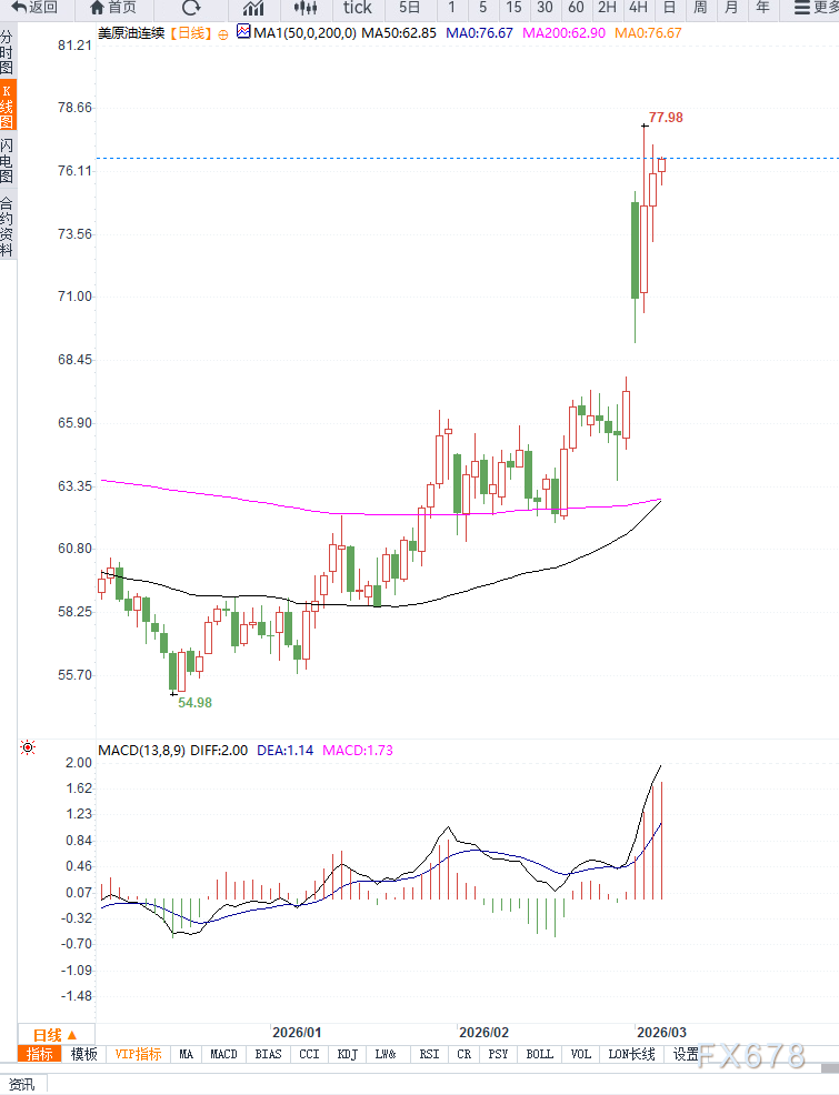 关键阻力:78美元为前期高点压力,一旦有效突破,目标将指向80美元整数关口。 关键支撑:72美元为短线防守位,若跌破则可能回测70美元心理关口。从4小时图来看,价格呈现阶梯式抬升结构,短期均线多头排列明显,回调多为技术性修正。整体来看,技术面与基本面形成共振,短线仍偏向震荡上行。
