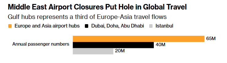 航班数据咨询机构 OAG Aviation 表示,自周六以来,主导海湾中转市场的阿联酋航空、卡塔尔航空和阿提哈德航空(Etihad)暂停常规航班,使得以“可用座公里”衡量的每日国际航班运力减少超过 10%。