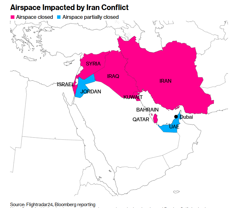 (伊朗冲突影响的空域 来源:Flightradar24、彭博)