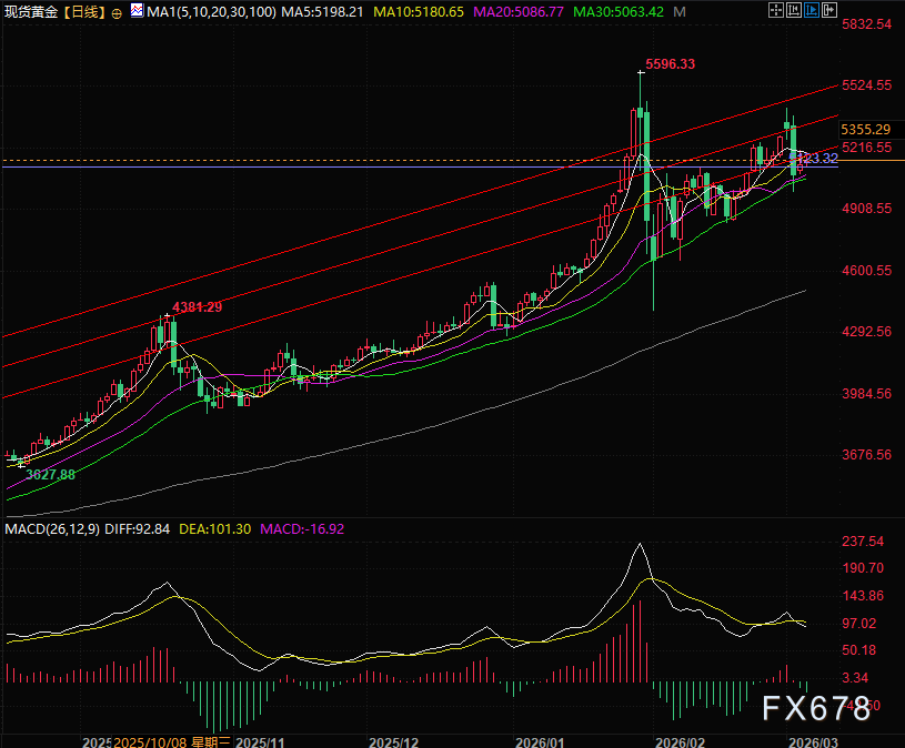 技术面现货黄金沿着上升通道下轨慢慢爬升,目前压力位在5200和上升通道下轨,支撑依然在5123关键位目前金价持续守在此价格水平上方,黄金最愿意看到的情况是能源价格不受太大影响但是战争继续的状况,但目前以、美、伊战事和霍尔木兹海峡等能源问题高度绑定,导致此次黄金上涨备受考验,黄金加在战争升级和利率爬升当中,必须战事升级但利率稳定才能有利于黄金的上涨。