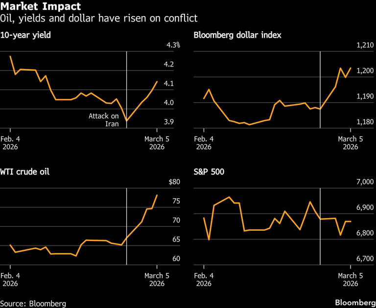 目前交易员仍将这一结果视为“尾部风险”,而非基准情景。周三标普500上涨、美元回落,原因是有报道称伊朗通过间接渠道与美方接触谈判(伊朗否认);但周四战事进入第六天后,油价、收益率与美元再度齐升,美股转而大幅下跌。