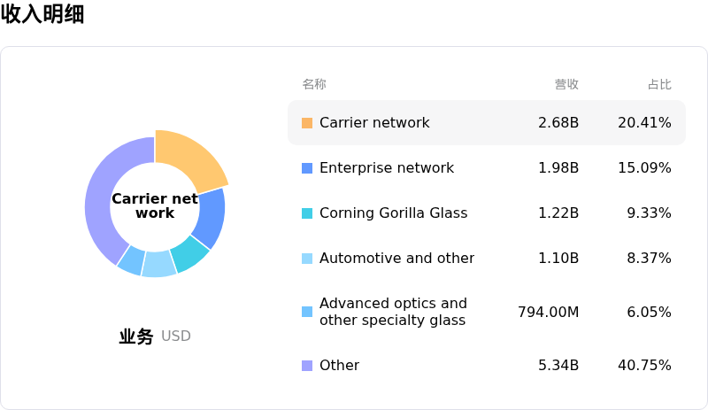 康宁(GLW)基本面分析康宁 (GLW) 处于科技设备行业,最新年度营业收入$15.63B,处于行业7,净利润$1.60B,处于行业3。「公司简介」