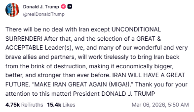 特朗普在社交媒体上发文称,除非伊朗“无条件投降”,否则不会有结束战争的协议。这一表态被市场视为美国对伊朗立场进一步强硬,也意味着短期内通过外交手段缓和局势的希望明显下降。
