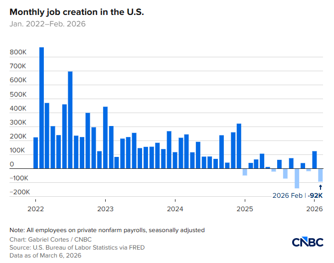 市场抛售背后的核心逻辑,是投资者对“增长下修、通胀抬头、政策受限”组合的担忧迅速升温。原本疲弱的就业数据应被视为有利于降息的信号,但在中东战争推高油价、可能重新点燃通胀的背景下,市场开始担心美联储将陷入更加被动的局面。