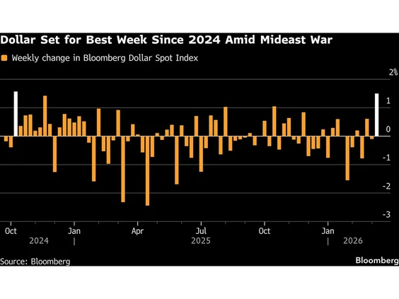 美元强势反弹 全球货币政策路径再生变数汇市方面,中东冲突升级带来的避险需求推动美元整体走强。美元指数本周有望上涨约1.4%,创下自2024年11月以来最大单周涨幅。