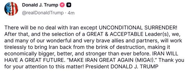 特朗普周五也在社交媒体上表示,他并不考虑以某种快速协议与伊朗结束战事。他写道:“除非伊朗无条件投降,否则不会有任何协议!”