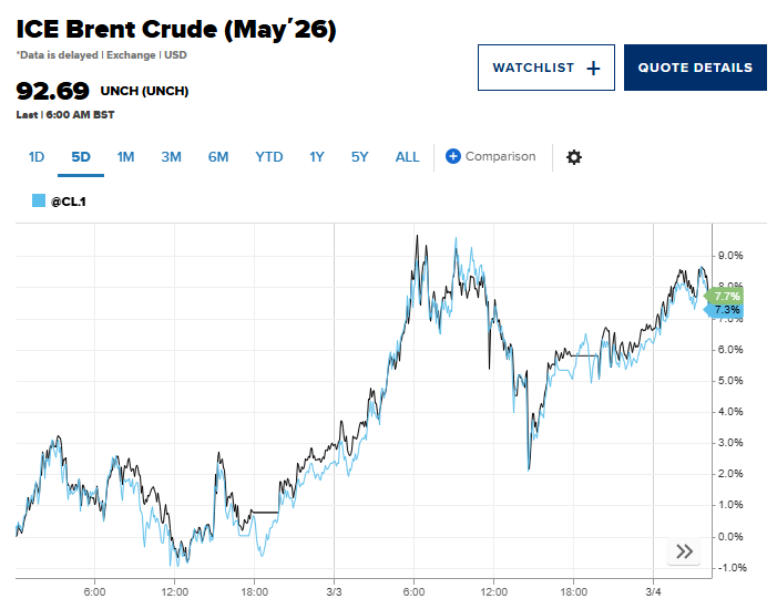 周五(3月6日)美市尾盘,美国WTI原油期货大涨12.21%,上涨9.89美元,收于90.90美元/桶。全球基准布伦特原油上涨8.52%,上涨7.28美元,报92.69美元/桶。