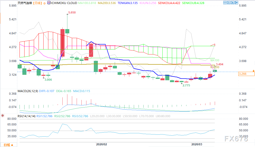 中东战事与霍尔木兹海峡封锁,正从基本面推动天然气价格上行,而技术面也同步发出多头信号:价格已站上Kijun线(3.256),Tenkan线(3.135)上穿Kijun形成短期金叉,MACD(DIFF0.106、DEA-0.165)同步金叉,RSI(53.112)回升至50上方,确认空头动能衰竭、多头开始主导。这与文章中“供应风险加剧、美国出口需求上升”的逻辑形成共振,短期趋势明确偏多。