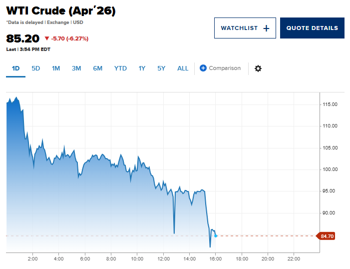 受此影响,WTI原油短线急跌14美元至81.7美元/桶,跌幅达11%。全球基准布伦特原油交易价格下跌 9%,至 82.27 美元/桶一线。