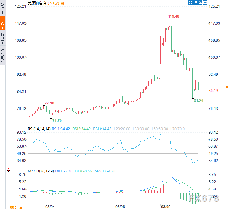 周二(3月10日)亚市早盘时段, 美原油价格震荡下行,现交投于每桶86.40 美元附近,日内跌幅约8.7%。此前一个交易日油价一度上涨到119.48美元的近四年高点,而后因G7与IEA讨论联合释放石油储备与特朗普考虑放松对俄油制裁而回落,盘后交易跌幅超过5%,现油价延续前日消息发出后的震荡下跌走势。