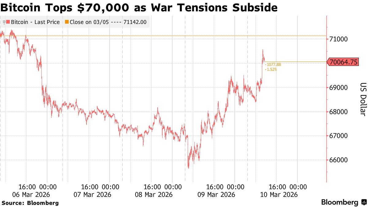 数据显示,这一原始加密货币在周二亚洲早盘一度上涨 2.32%,至 70,581美元。在油价回落的同时,比特币与全球股市一道反弹,收复了此前部分跌幅。此前,特朗普表示,与伊朗有关的冲突将“很快”得到解决,推动市场情绪自周一的避险状态中出现逆转。