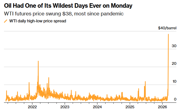 回顾周一,原油市场经历了近年来最剧烈的波动之一。WTI原油期货日内振幅高达38美元,创下疫情以来最大单日波动幅度。这一走势凸显出,在当前中东局势持续紧张背景下,能源市场对消息面的敏感度已被明显放大。